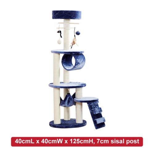 ROOMY AND ENJOYABLE: Nicely cushioned and large platforms with raised edging for your fur babies to sit on and look out the window, spacious tunnel with plenty of lounging room for your kitties to sleep, sisal scratching posts to deter cats from clawing up your furniture, a cozy hammock, interactive sisal toys to play with, several layers layout for climbing up and down. STURDY AND STABLE: Super solid construction, well balanced design, strong base, cats can easily and safely leap on or off this cat tree. QUALITY PLUSH COVERING: The cat tower is composed of good quality plush material, which is very soft and comfortable, your furry family members will love the plush touch and enjoy exploring and sniffing around its new home,no scratching your furniture anymore EASY TO ASSEMBLE AND NICE LOOKING: Its attractive look will compliment any room in your house like a piece of nice pet furniture rather than a jungle gym. SIZE: 40cmL x 40cmW x 125cmH, 7cm sisal post