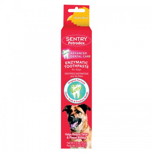 SENTRY Petrodex Advanced Dental Care Enzymatic Toothpaste is formulated specifically for pets. With patented enzymes, this non-foaming formula works hard but does not require rinsing. With regular use, it helps control plaque and fights bad breath. Best of all, it comes in a delicious poultry flavor that dogs love!